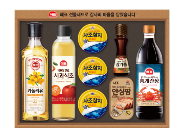 - [사조] 안심특선 V25호 (카놀라유 500ml*1개 + 사과식초 500ml*1개 + 홍게간장 500ml*1개 + 참기름 55ml*1개 + 살코기 참치 85g*3개 + 안심팜 115g*1개)
