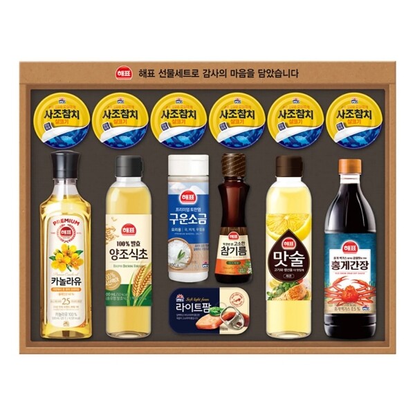 - [사조] 안심특선 V66호(살코기참치 85g*6개,카놀라유 500ml*1개,양조식초 500ml*1개,라이트팜 115g*1개,토판소금 200g*1개,고소한참기름 110ml*1개,맛술 500ml*1개,홍게간장 500ml*1개)